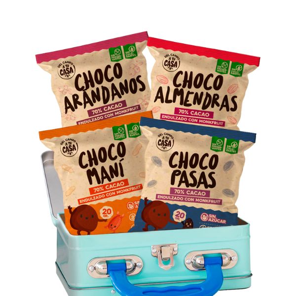 Frutos naturales cubiertos con chocolate real. Endulzados con monkfruit. Incluye maní, pasas, arándanos y almendras.